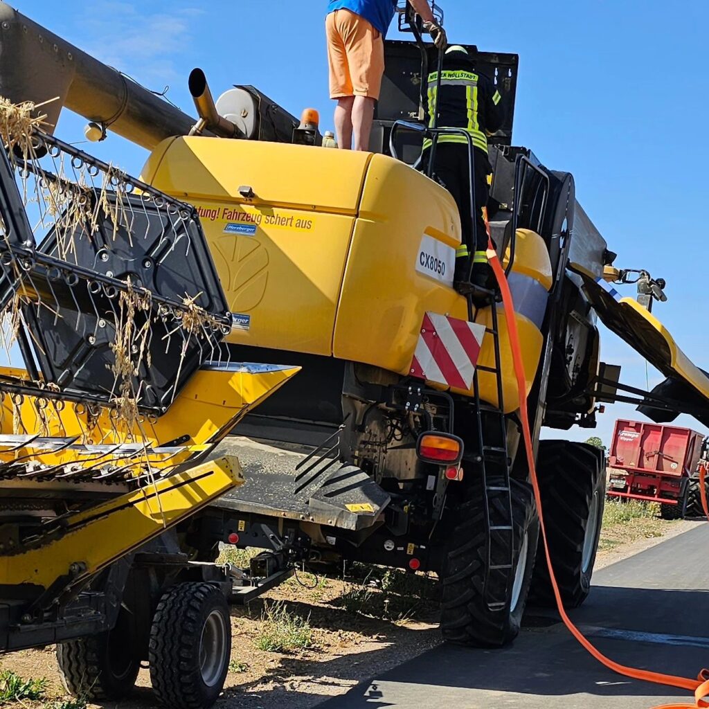 Zu unserem 20. Einsatz im laufenden Jahr rückten wir heute auf die B3 Richtung Okarben aus. Aus einem Mähdrescher würde Rauch, aus dem Motorraum, kommen. Vor Ort stellte sich heraus, das glücklicherweise nur Ernte-Staub auf dem Motor rauchte. Wir kühlten den Bereich vorsorglich. Der Landwirt konnte im Anschluss seine Fahrt zum Feld fortsetzen.